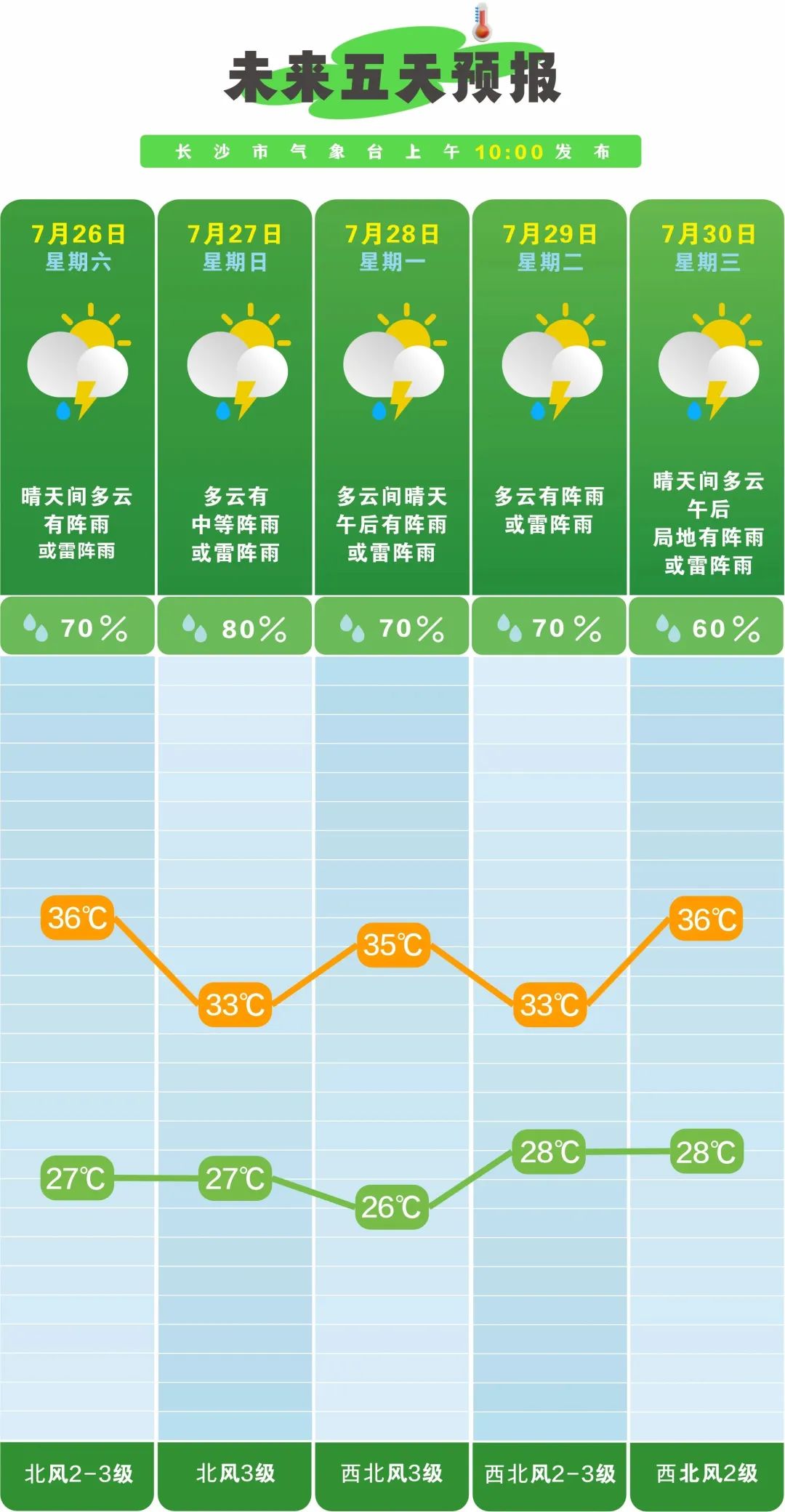 27日晚上至28日白天,多云到阴天,有阵雨或雷阵雨,湘东、湘南部分地区中雨,株洲南部、郴州东部局地大雨;北风2~3级,雷雨时局地阵风7~9级;最高气温32~36℃,最低气温23~27℃。