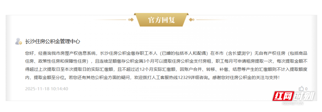 近日,有网友在红网《百姓呼声》栏目咨询长沙市住房公积金能否可像湖南省公积金一样实行按月提取政策。对此,长沙住房公积金管理中心作出详细回应,明确了当前提取的相关规定。